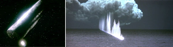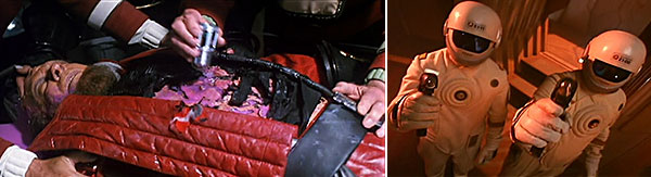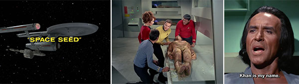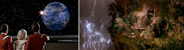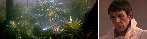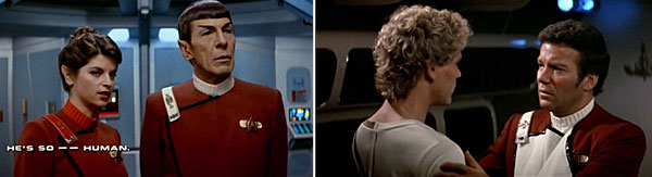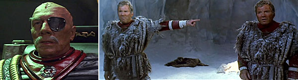 ปี ค.ศ. 2285 : เหตุการณ์ใน Star Trek II (ภาค 2 ) : The Wrath of Khan : ศึกสลัดอวกาศ![]() หลังจากภาคแรก ก็มีทั้งคำชมทั้งคำด่าตามระเบียบ ที่ชมส่วนใหญ่ก็เป็นแฟนพันธุ์แท้สาวก Trek ผู้ติดตามชมต่อเนื่องมาตั้งแต่ชุดทีวีซีรี่ส์ เพราะแนวหนังมันเข้าทางเคมีเขาอยู่แล้วนั้นเอง (*อีกอย่าง หากเข้าขั้นเป็นสาวก ต่อให้หนังมันไม่มีอะไรมาก แต่ได้ดูทีมดารา-ฉากอวกาศ ยังไงก็พอใจ) ส่วนที่ด่าก็จะเป็นคนดูทั่วๆไปที่ไม่ได้ถึงขั้นเป็นแฟน Trek ก็ด้วยเหตุหนังมันจะเชิงปรัชญาไปนั้นเอง จึงอาจเข้าถึงมวลชนยากหน่อย...ด้วยเหตุนี้ ภาค 2 ทีมงานจึงคิดจะลองปรับเปลี่ยนแนวหนังมาเป็นเชิง ไซไฟ - แอ๊คชั่น ผสมด้วยดูด้วยบ้าง - การปรากฏตัวครั้งแรกของ "ข่าน" ในทีวีซีรี่ส์ฉบับ Original ปีแรกตอน 22 ชื่อตอน "Space Seed" (ฉาย 1967) ตอนนี้ก็ถือว่าเป็นอีกตำนานของ ทีวีซีรี่ส์ ที่แฟนๆ Trekkies ชื่นชม-กล่าวขวัญ-จดจำที่สุด - - การกลับมาอีกครั้งของ "ข่าน" และสาวก ปฏิบัติการล้างผลาญ ยานเอ็นเทอร์ไพรซ์ในภาพยนตร์ The Wrath of Khan - เผอิญ ณ ช่วงเวลานั้นชาวโลกตื่นตัวกันมากขึ้นกับหนังแนวอวกาศ อันเนื่องจากการมาของ Star Wars และด้วยชื่อหนังมีคำว่า Star... ทำนองเดียวกันก็เป็นว่า Star Wars - Star Trek กลายเป็นคู่แข่ง-คู่เปรียบเทียบกันไปโดยปริยาย ทีมงานสร้างจึงมีความคิดจะสร้างภาค 2 ให้อลังการยิ่งขึ้น(เพื่อต่อกรกับ Star Wars ด้วยนั้นเอง) แต่โชคไม่ดีนักทางนายทุน Paramount ชักไม่แน่ใจในศักยภาพของหนัง Star Trek เลยหั่นงบแบบสุดๆ ภาคแรกงบประมาณอยู่ที่ประมาณ 35 ล้าน แต่ภาคนี้เจอยื่นคำขาด 10 ล้านขาดตัว(โหดทีเดียว) ทำให้การสร้างหนังภาคนี้เป็นไปอย่างเขียมๆ-ประหยัดกันสุดตัว เนื้อหาภาคนี้เข้มข้นขึ้นมากทีเดียว ตัวเอกอย่างกัปตันเคิร์กมีมิติมากขึ้น ไม่ว่าจะการต้องมารับมือกับข่าน ไหนจะต้องจัดการเรื่องปัญหาชีวิตส่วนตัวอีก (เขาต้องกลับมาเจอกับแฟนเก่าที่ชื่อว่า ดร.แครอล มาร์คัส (Bibi Besch) พร้อมทั้งลูกชาย เดวิด (Merritt Butrick) ) นอกจากนี้ตัว สป็อค (Leonard Nimoy) ก็ต้องมานั่งเทรนลูกศิษย์คนใหม่ซึ่งเป็นชาววัลแคนสปีชี่ย์เดียวกัน นามว่า ซาวิค (Kirstie Alley)...ก็ลองคิดดูว่า เมื่อ ชาววัลแคน 2 คน มานั่งคุยกันมันจะเป็นไง (คนขี้รำคาญอย่าง หมอแม็คคอย แทบบ้าไปเลย)...และในภาคนี้ยังมีไอเดียบรรเจิด กระตุ้นจินตนาการเชิงวิทยาศาสตร์ นั้นคือ โครงการลับที่ชื่อ "Genesis" อันเป็นเทคโนโลยีขั้นสูง สามารถสร้างชีวิต-ดาวใหม่ขึ้นมาทั้งดาว! ซึ่งเป็นเทคโนโลยีที่ ข่าน ต้องการเป็นอย่างยิ่ง - ภาพซ้าย อาจารย์-ศิษย์ ชาววัลแคน สป็อค และ ซาวิค : ขวา กัปตันเคิร์ก กับลูกชาย เดวิด - หนังภาคนี้โดยรวมทำได้สนุกลื่นไหลขึ้นมาก น่าติดตามตลอด ยิ่งช่วงท้ายๆได้ลุ้นกันมากทีเดีย